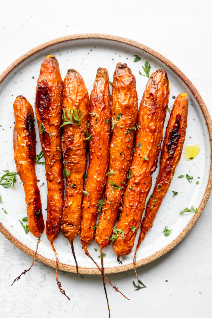 This recipe is very versatile and can be made with all different cuts of carrot, so make sure to adjust your cook time for each. Sometimes I thinly slice the carrots into 1/2 inch thick pieces. I like this version because the carrot pieces are more bite-sized. Each piece also gets more of the spice rub. If thinly slicing your carrots, adjust your cook time to 25-30 minutes since they will cook faster.